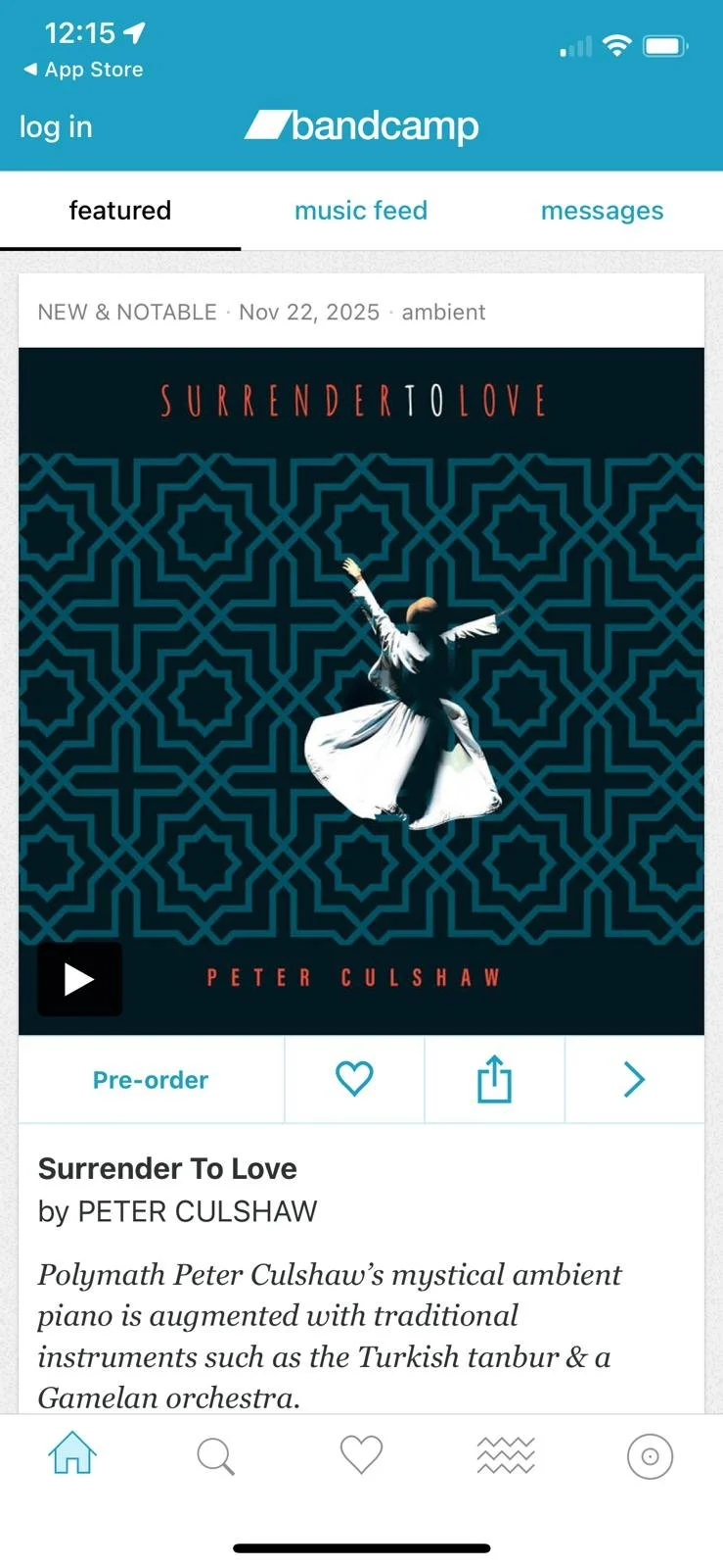 The film ‘SAMA: To Listen’, a Sufi trip, was shot in Fes, Istanbul and Malaysia. Much of this album (Surrender To Love) was recorded on that trip with local musicians. Resulting sessions were sculpted into incidental music for the film - 8 tracks from here and 6 tracks from the earlier album “Music From The Temple Of Light”.